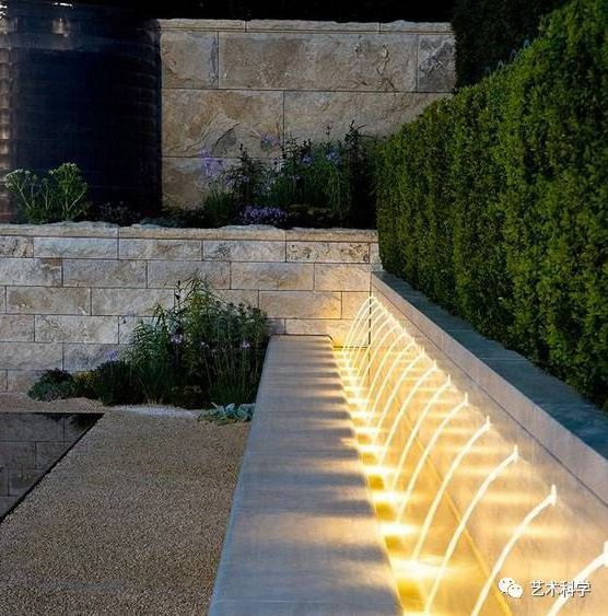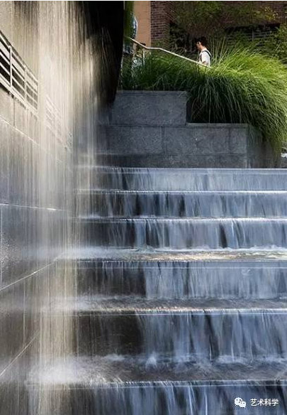 跌水是指規(guī)則形態(tài)的落水景觀,多與此同時(shí)建筑、景墻、擋土墻等結(jié)合,跌水表現(xiàn)了水的墜落之美。