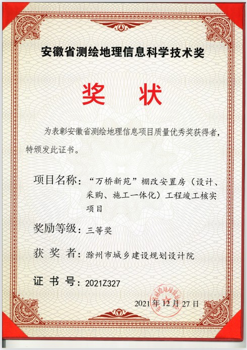 安徽省測繪地理信息科學技術(shù)獎三等獎